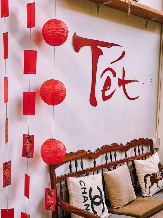 Chọn một hoặc vài điểm trang trí nổi bật để thu hút sự chú ý, chẳng hạn như lồng đèn lớn, cây mai, hoặc bảng chúc Tết.